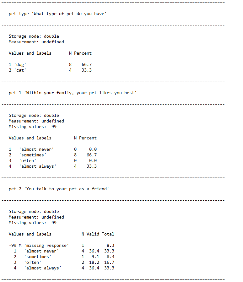 Before we review the packages, I wanted to introduce some example data I used to test out our codebook packages. These are made up responses to a few survey items that I found online about pet ownership and attachment and I thought they were fun questions to work with. We have 3 questions about pet ownership. And they all have this response option range of….